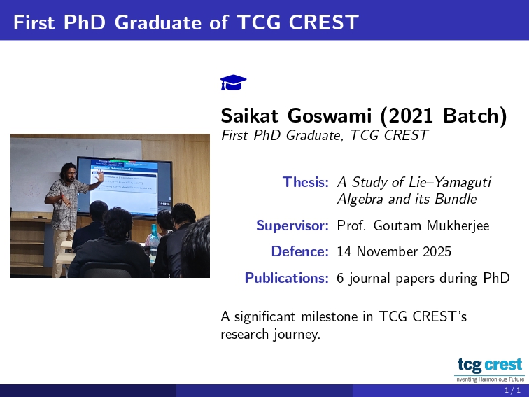 TCG CREST proudly celebrates a historic academic milestone as Mr. Saikat Goswami, a research scholar at the Institute for Advancing Intelligence (IAI), successfully earns his Ph.D.