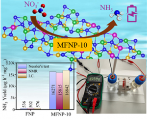 - In a recent paper published by Bharati Debnath with Dr. Amreen Bano and their research group in Small (2025, 10.1002/smll.202513455) entitled “Upcycling Nitrate Waste into Power: Designing Mo-Incorporated Ni–Fe-Based Phosphide Nanosheets for Electrocatalytic Green Ammonia Synthesis and Zn–Nitrate Batteries”, the authors reported Mo-incorporated FeNiP nanosheet electrocatalysts for highly efficient nitrate-to-ammonia conversion under neutral conditions. The optimized MFNP-10 catalyst delivered an ammonia yield rate of 16,271.27 µg.h-1.mgcat-1 with a Faradaic efficiency of 96.45% at −0.6 V vs. RHE. In situ ATR-FTIR and machine learning-assisted DFT confirmed enhanced nitrate adsorption and reduced activation barriers induced by Mo incorporation, while integration into a Zn-nitrate battery achieved a peak power density of 9.73 mW.cm-2, demonstrating simultaneous energy generation and sustainable ammonia production