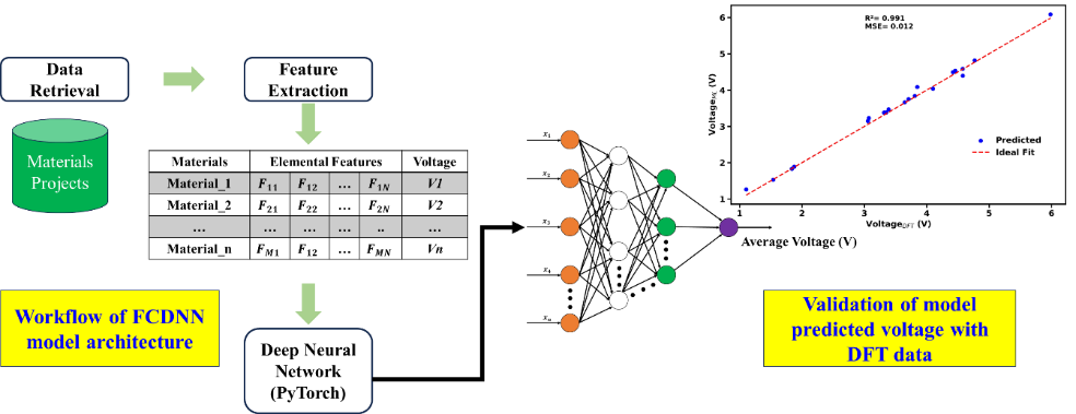 - In this recent study, “Integrating Density Functional Theory with Deep Neural Networks for Accurate Voltage Prediction in Alkali-Metal-Ion Battery Materials”, accepted in Small Methods (2025), G. P. Das contributed with his theoretical expertise. The work combines high‑throughput data, machine learning, and selective DFT checks to establish an efficient “screen‑then‑validate” workflow for cathode discovery. A deep neural network trained on 4,300 battery materials predicts the average voltage of new compounds within seconds, achieving a mean absolute error of just 0.24 V, thereby significantly reducing the time and cost of identifying viable alkali‑metal‑ion battery materials.
