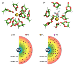 - In this recent study, “Tuning Interphase Composition in Sodium-Ion Batteries via Co-Solvent Selection and Anion-Driven Solvation Shell Engineering”, accepted in Small Methods (2025, e01563), https://doi.org/10.1002/aenm.202503573, Amreen Bano, along with the experimental team, explored computationally how co-solvent selection and anion-driven solvation shell engineering influence interphase formation in sodium-ion batteries. The computational insights revealed that low-viscosity, weakly solvating carbonates (DMC and DEC) facilitate the incorporation of both salt and additive anions (PF6−, BF4−, TFSI−) into the primary solvation shell. This mechanism promotes the development of anion-rich, ion-conducting interphases on hard carbon anodes, enhancing initial coulombic efficiency and rate performance, while also supporting inorganic-rich cathode electrolyte interphases on titanium-doped sodium nickel manganese oxide cathodes.